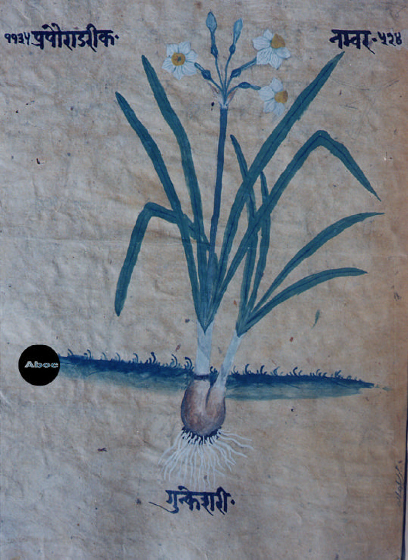 本書は手書きのアーユル・ヴェーダ本草図譜で、10巻より成る。そのうち8巻は植物篇で約800種類を扱い、1巻は動物篇で約100種類、1巻は鉱物篇で約70種類が扱われている。植物篇は1頁に1種類の植物が、葉はもちろん、花と実と根が必ず描かれ、生育場所を示す背景も描き込まれている。すべて着色図である。樹木が多いがその他の有用植物、とくに野菜や穀類は描写が精細で、たくさんの品種が紹介されている。イネは18種類、サトウキビは13種類も描かれている。ただし、区別がよくわからないものもある。裏面にはその植物に関する古典の記事がサンスクリット文とネパール文で記され、多くの言語によるその植物名が列記されている。アーユル・ヴェーダはインドに伝わる伝統医学の体系で、体全体の調和を保って健康に長寿を保つことに基本が置かれる。記事を読んでみると、それぞれの植物の効能や適用症もさることながら、西洋医学とは異なった考え方があることがわかり、興味深い。もっとも、図と記事が対応しているかどうかは検討を要する。
