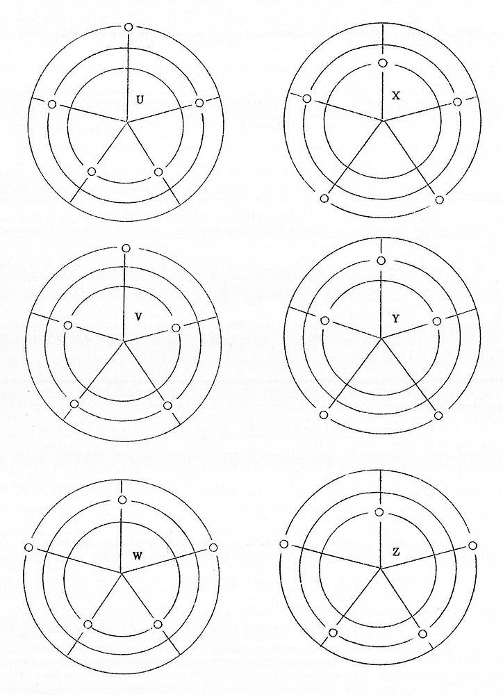 こういうモデルを思いつくと、その変形がすぐ出てくる。即ちV-Zの5型で、Uを入れて全部で6型である。各型の1番手前の2枚の花弁の重なり方が2通りあるから、総計12型となる。このうち隣り合う弁の内外関係という点から見ればVとYは同じであり、WとZも同じである。この4つはquincuncialである。換言すれば、この4つは相称としてもラセンとしても説明できるということになる。Xは少々異なって見えるが、実際に弁の重なりを描いてみればUを廻してできる型と同じであり、最外と最内の弁の間に他の弁が1つはさまったimbricateである。Xの型はスミレがこれに当たるだろう。