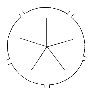 前回、5花弁の重なり方は32通りあると云った。重なりが起こる個所が5つあってそれぞれ2通りの重なり方があるから、2⁵で32通りである。もしある植物の花を観察の結果、これら32通りが一様に出現するならば、花被片の重なり方は偶然が支配するとみてさしつかえなかろう。これを確かめるには、これらの組み合わせの見本を作っておいて、実際とくらべればよい。32通りも作るのはシンドイと思うだろうが、やってみると大したことではない。使宜上見方を変えてやってみる。