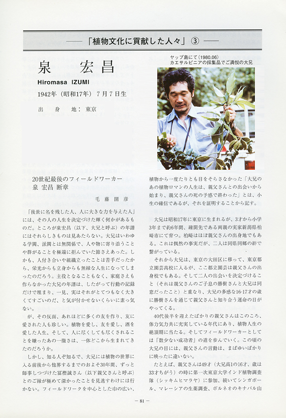 以上、小生のかかわったことを中心に、確認できる範囲を駆け足で記した。「植物文化に貢献した人」という今回いただいたテーマに応えられる「泉宏昌の全貌」にはほど遠いと思う。小生の知らないことや書けなかったこと、抜けたこともたくさんある。が誌面は尽きた。初期のころの大兄については親父さんのご子息の冨樫勝樹さん、高橋勉(元武田)さんら、絶頂期のころやフィールドワークに関しては 内藤俊彦(東北大)さん、神田博史(広島大)さん、 高野昭人(昭和藥科大)さん、香月茂樹(元北里大)さん、後藤勝実(京都薬科大)さん、桝田信弥(東京農大)さん、立石庸一(琉球大)さん、吉田尚利(北大)さん、森和男(ナチュラリスト)さん、渡辺高志(北里大)さんら、そして東薬時代は恩師の指田豊先生、佐竹元吉先生らが詳しい。その全体が合わさって「泉宏昌論」が完成するはずである。
